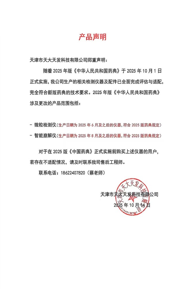 | 尊敬的各界朋友們: 歡迎您進入天津市天大天發科技有限公司的網站進行瀏覽,首先感謝各界朋友多年來對天大天發藥品檢測儀器和分析儀器的關心與支持! 天津市天大天發科技有限公司是通過ISO9001質量管理體系認證、ISO14001環境管理體系的認證的高新技術企業,是專業的藥檢儀器和分析儀器的制造廠商。 我們的產品包括藥品溶出儀系列、微粒檢測儀系列、內毒素檢查儀系列等40余種產品,主要產品覆蓋了全國所有省區,部分產品已進入海外市場。公司在藥檢領域樹立了良好的品牌形象,贏得了廣大用戶的贊譽。 公司將更好地適應瞬息萬變的市場,增強企業的核心競爭力。抓住全球經濟飛速發展的歷史性機遇,以創新精神進行新的創業。以高起點、高速度、高效率創造出中國藥品檢測儀器和分析儀器領域中的品牌形象,立足中國,走向國際。 我們熱切希望您成為天大天發科技有限公司的合作伙伴! |